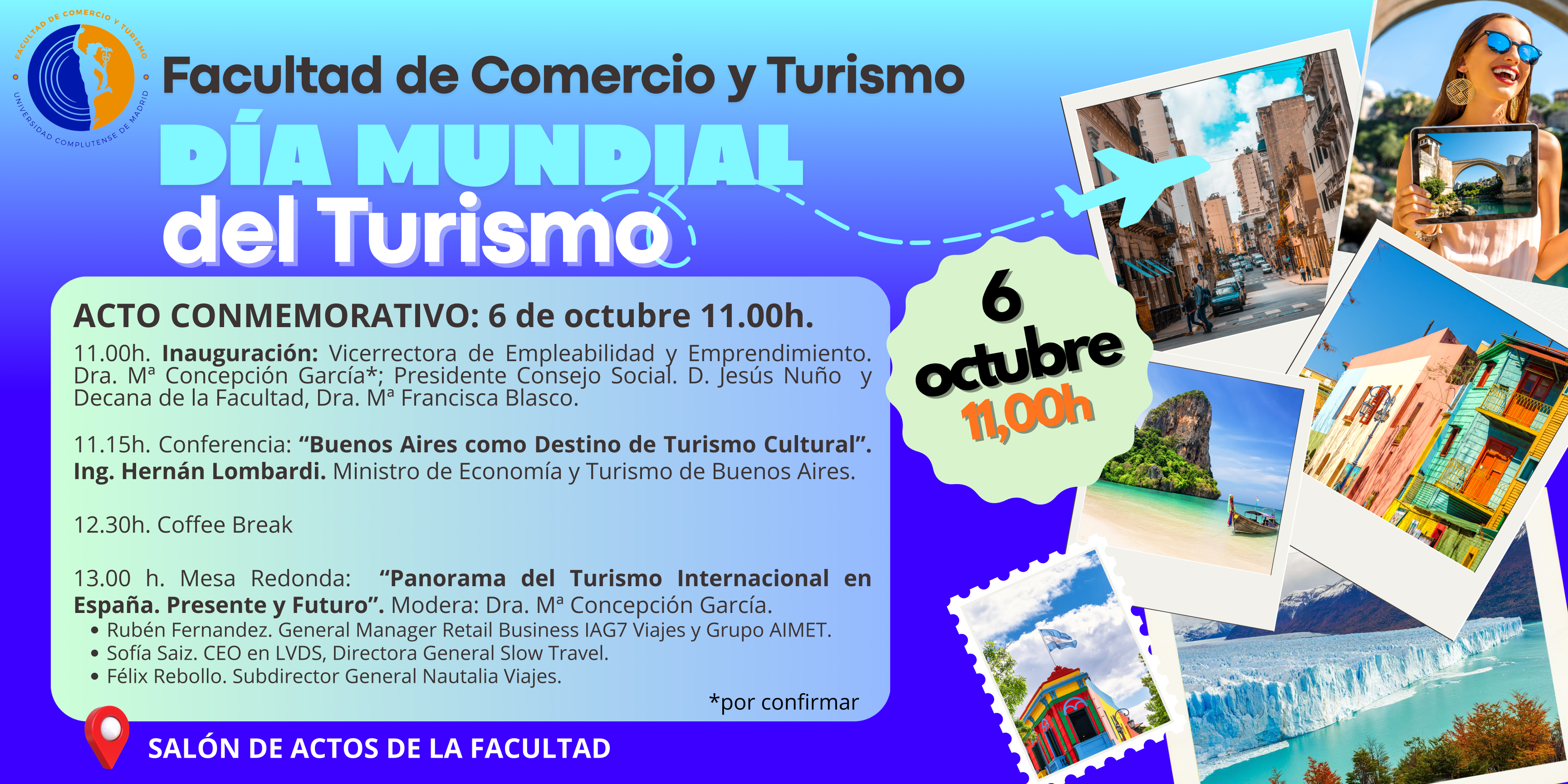 La Facultad de Comercio y Turismo se suma a las celebraciones por el Día Mundial del Turismo con una jornada en la que expertos nacionales e internaciones del sector abordarán el presente y el futuro del sector. Tendrá lugar el 6 de octubre, a partir de las 11h, en el Salón de Actos de la Facultad.